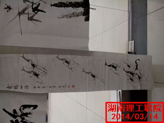 讲座前,在图书馆2楼报告厅前书画家各展风采,涉及题材丰富,形式多样,包罗万象,有飘逸清秀的行书,有万马奔腾的草书,刚劲有力的篆书;有栩栩如生的虾画;有生机勃勃的竹笋画。这次作品吸引着大批老师,同学驻足观看。整个学院都环绕着笔墨的气息。