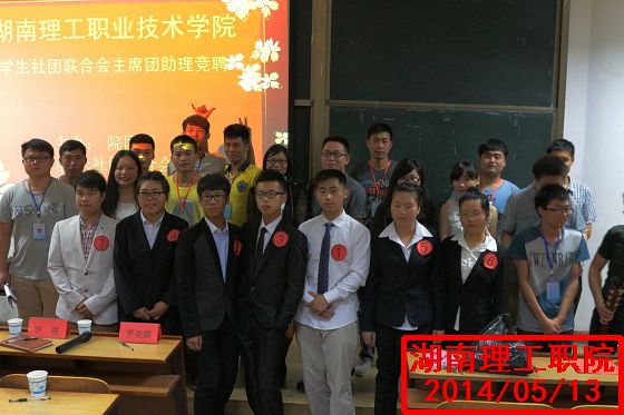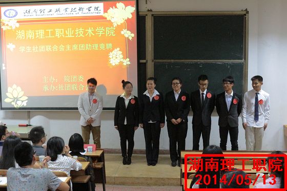 2014年5月13日,湖南理工职业技术学学院社团联合会在在三教110教室进行了社团联合会主席团助理竞聘大会,院团委罗美霞书记和李强老师出席了竞聘大会,学联、社联、三系的主席团成员一同参与了本次活动。