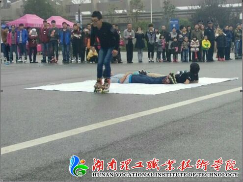轮滑活动区,由开始的拉龙活动到轮滑冠军的地平式绕桩等表演,都赢得了现场观众无数叫好声与欢呼声。湘潭市轮滑协会带来的压轴表演更是聚集了我院等多所湘潭高校的轮滑爱好者们。同样,湘潭127Slide刹车队带来的“极限跳人”,更是精彩绝伦。轮滑爱好者们帅气的从趟在地上的挑战者身上跳过,从挑战2人增加到最后的9人,并且无一失误,可见技术之精湛。