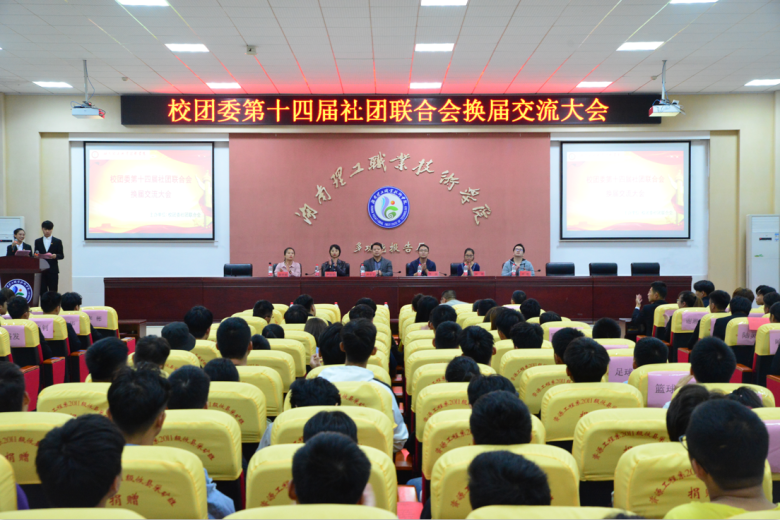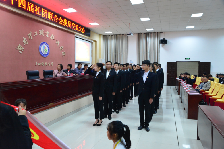 2018年11月1日晚19:00,第十四届社团联合会换届交流大会在博学楼报告厅召开。副校长周金玉,校团委副书记李强,校团委李丽莎、新能源学院团总支书记杨菲、管理艺术学院团总支书记郭亚婧、智能制造学院肖琨,各学生社团指导老师以及校学生会、社团联合会、各二级学院学生会主要学生干部参加了此次大会。大会由谭志海、谭野同学主持。