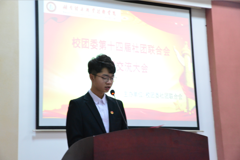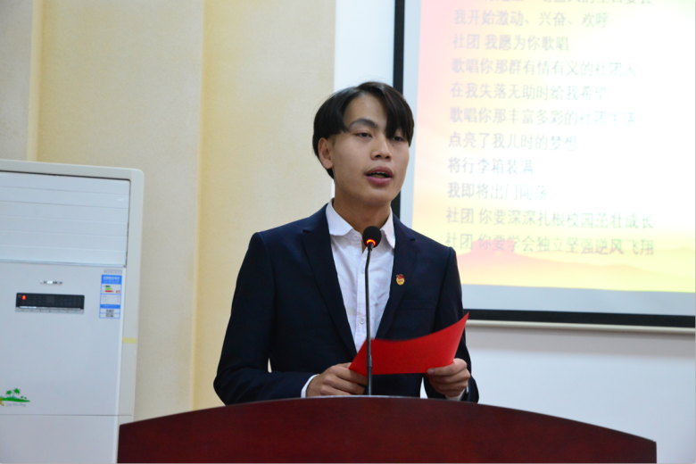 第十三届社团联合会主席伍继雄发言,他强调社联一直以来秉承的“始于社团,不止社团”的精神,回顾总结了各个社团的优良成绩并对新一届社团联合会的工作提出了希望。随后他邀请十三届社联副主席朱毅上台朗诵自己的原创诗歌《社团,我愿为你歌唱》,他声情并茂的朗诵,引起了大家的共鸣,赢得了现场观众热烈的掌声。