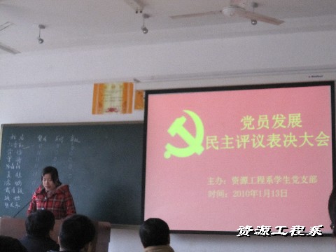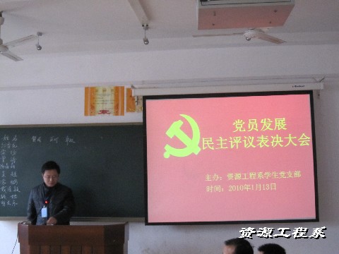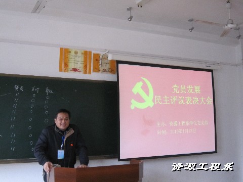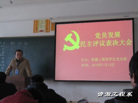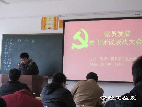 2010年1月13日下午三点,资源工程系学生党支部学生党员发展民主评议大会在三教301教室举行,出席此次会议的领导有系党支书记黄靖龙老师,系党支副书记肖高老师,全体辅导员老师参加民主评议大会。