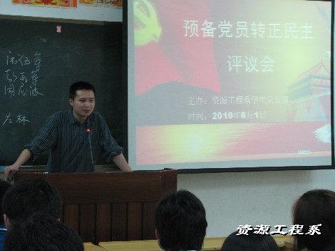 6月1日晚上7:30分,资源工程系学生党支部在3教301教室召开预备党员转正民主评议会,与会的有系党总支副书记李治国老师、系部辅导员谭君老师、郭赟登老师、陈柏舟老师、学生党员牛力及全体学生预备党员。会议由系学生党支部书记欧又瑞老师主持。
