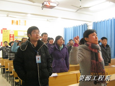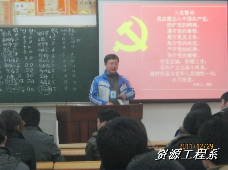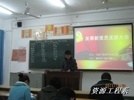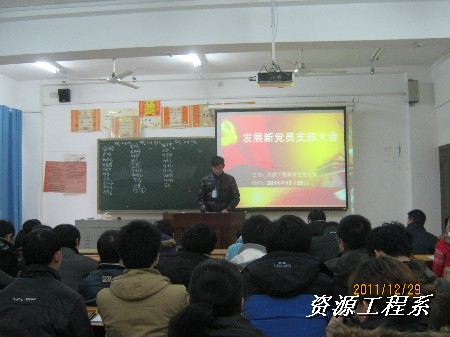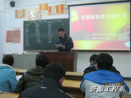 (资源系 李军供稿)2011年12月29日下午4点,我院资源工程系“发展新党员学生支部大会”在三教108顺利召开。大会由系学生会党总支部书记郭赟登老师主持,出席会议的领导有:资源工程系党支部副书记副主任李治国老师、系学生党支部正式党员5人、发展对象28名及介绍人喻训谦、赵奇、杨益梅、毕业、谭君老师参加会议。