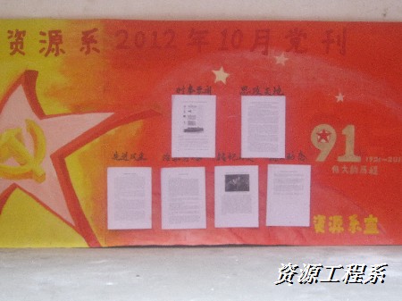 (资源系 赵奇 刘掌供稿)为迎接党的十八大胜利召开,资源系在积极筹备党刊专栏,党刊主要分为六个板块:思政天地、时事要闻、铭记历史、先进风采、治学方略、组工动态。党刊诣在及时向广大学生宣传党的路线、方向、政策,当好党和学生之间联系的桥梁和纽带,夯实党的执政基础。