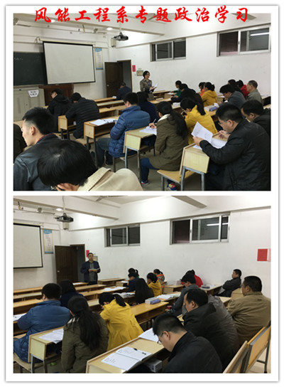 2015年11月17日下午4点,风能工程系党总支在三教学楼208教室召开全体教职工会议,专题学习《中国共产党第十八届中央委员会第五次全体会议公报》。会上就如何学习好、理解好、落实好十八届五中全会精神以及做好系部各项工作目标任务进行了安排部署。