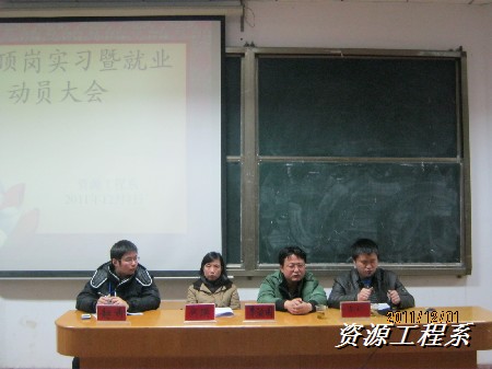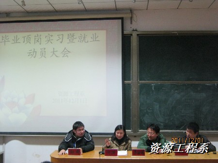 (资源系 李军供稿)为了进一步完善我系毕业生顶岗实习和就业工作,我系于2011年12月1日,晚7点30在多媒体一举行“毕业顶岗实习暨就业动员大会”出席此次大会的嘉宾有资源工程系副书记副主任李治国、系副主任何瑛、系学管干事朱礼、09级辅导员赵奇,以及09级机械和机电专业的毕业生共同参加,大会由赵奇老师主持。