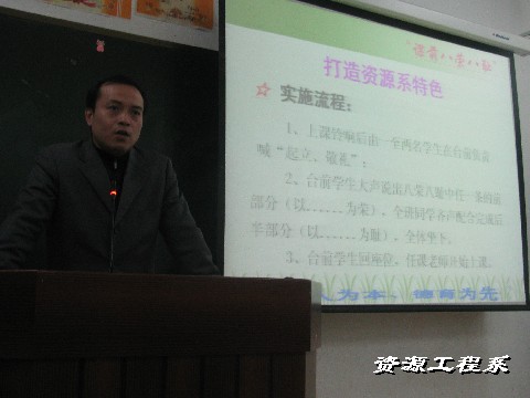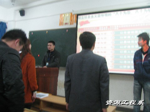 2010年1月14日下午2:30分,彭军林老师《课前八荣八耻》研究成果演示会在三教学楼301教室举行,此次成果演示会得到资源工程系领导高度重视,系主任党总支书记黄靖龙、系副主任党总支副书记肖高出席了此次会议,辅导员李治国、欧又瑞同系建制班班长、班级优秀学生骨干一共63人观摩成果演示会。
