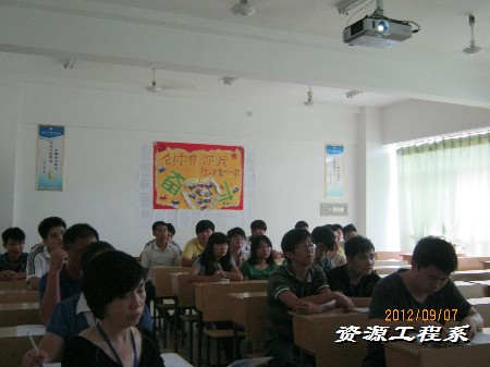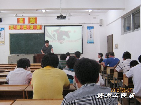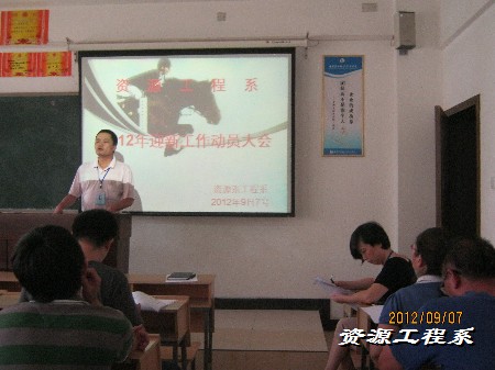 (资源系 赵奇 李军供稿)为积极响应学院号召,确保2012级新生顺利报到。9月7日下午,资源工程系在三教208教室隆重召开“资源工程系迎新动员大会”。与会人员有:资源工程系主任何瑛老师,系副书记、副主任胡志军老师,系副主任杨益梅老师,系学管干事朱礼老师,2012级辅导员赵奇老师、2012级所有班主任、助班,以及学团干部共同参加。大会由胡志军老师主持。