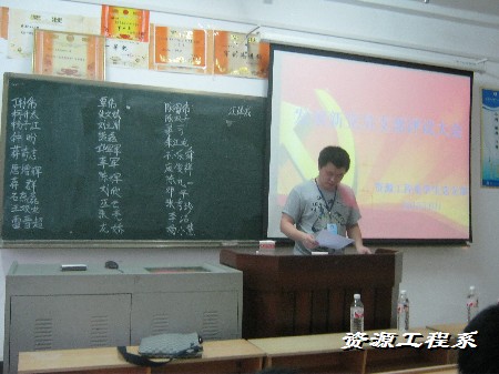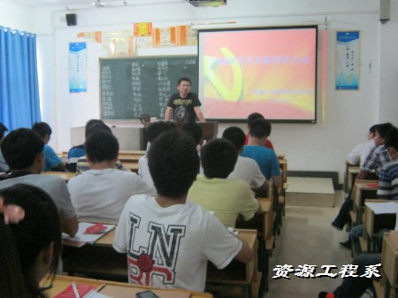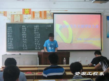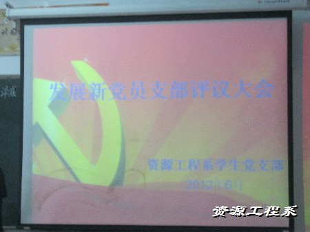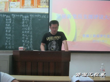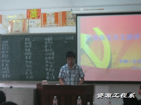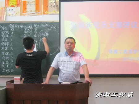 (资源系 李军供稿) 6月14日下午,我院资源工程系“发展新党员支部评议大会”在三教107顺利召开。大会由系团总支书记陈柏舟老师主持,有资源工程系党支部副书记副主任胡志军,系学生党支部正式党员5人,介绍人郭赟登、赵奇、朱礼、陈柏舟、周迎春等领导老师出席,及33名发展对象共同参加。