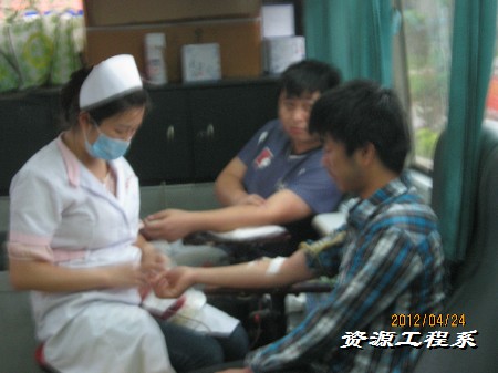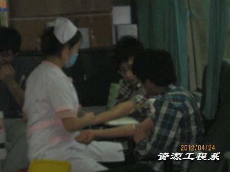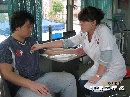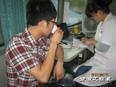 (资源系 李军供稿)2012年4月24日,15点至18点在食堂前坪隆重举行了由资源工程系党总支副书记副主任胡志军联系湘潭市中心血站共同组织的“无偿献血,无尚光荣,奉献爱心,回报真情”大学生义务献血活动。
