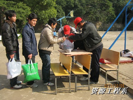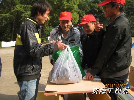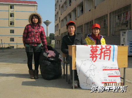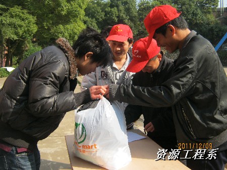 (资源系 李军供稿)为了积极响应时代的号召,资源工程系志愿部为了湘潭市救助站的社会流浪人员进行物质捐助,全体志愿部及外联部成员于2011年12月8日、9日下午、10日在校内面对全院全体师生,在校外面对曙光社区居民进行了“爱心传递,物质募捐”活动。