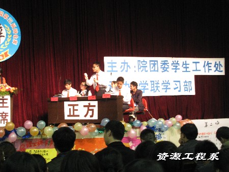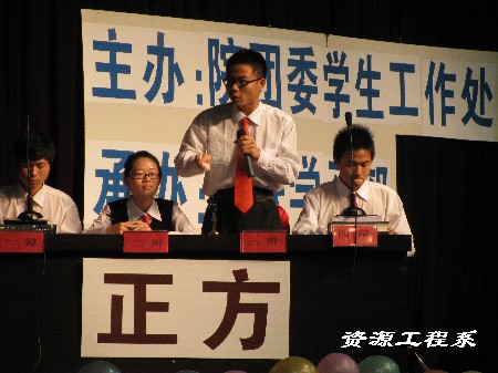 (系学习部供稿)2010年4月20日晚7点半,由湖南理工职院院团委学生工作处主办的第六届“理工杯”辩论赛决赛在报告厅正式拉开帷幕。 经过赛前的精心选拔和培训,系部李江南、杨雷雨、谢波、朱立军四位同学参加了学院辩论决赛。赛场上,他们据理力辩,针锋相对,但却从容不迫,文质彬彬,给我们上演了一场激情盎然,扣人心弦的唇舌之战。他们用实际行动诠释了当代大学生的青春风采和思辩才华,再一次用实力赢得了师生的认可和支持。