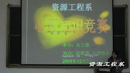 (系女工部供稿) 为了提高大学生的心理素质,增强大学生的健康心理意识,让健康心理的知识洒向我们生活的每一个角落。我系女工部于2009年12月3日晚上七点在多媒体四针对大一学生开展了以“健康心理,精彩人生”为主题的心理健康知识竞赛。
