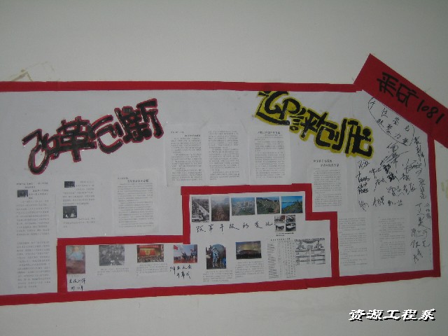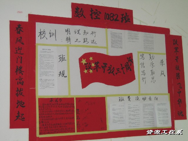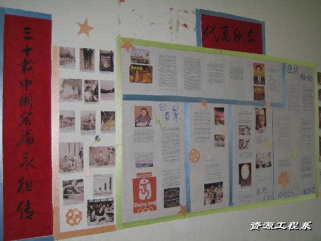 迎来改革开放的三十周年,同时也是教育部对我院进行人才培养水平工作评估的一年。为广泛宣传改革开放取得的伟大成就,了解学院三十年的发展历程,引导同学们树立“迎评创优你我有责”的良好意识,资源工程系主办了“纪念改革开放三十周年”系列活动。活动以“改革开放”和“迎评创优”为主题,分成四个部分:学习园地宣传资料展、各班墙报设计、主题班会和心得征文,在08级各班深入展开,历时十天。在系辅导员和主席团、书记处的指导下,经系学习部成员共同努力和协作,此项活动取得圆满完成。活动中,得到系宣传部大力支持,08级各班班委会热情配合,大同学广泛参与,使整个活动顺利开展,取得了良好的爱国、爱校教育效果。