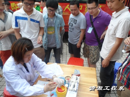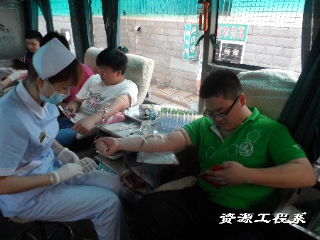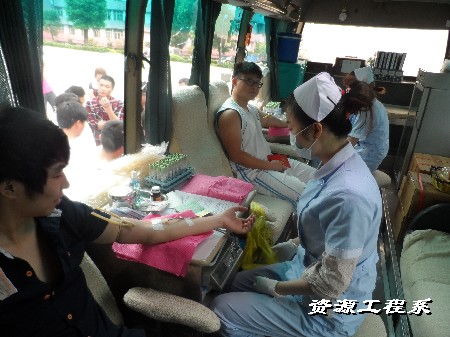 为了弘扬中华民族传统美德,提高大学生自身社会责任感,展现青年志愿者关心社会,服务社会的精神风貌。2013年5月15日,由学院与湘潭市红十字血液中心共同组织的“无偿献血,无尚光荣,奉献爱心,回报真情”大学生义务献血活动在我院食堂前坪开展,资源系同学积极参加献血活动。