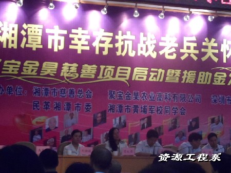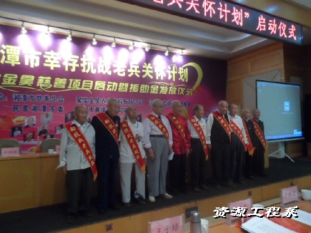 为加强大学生思想政治教育,传承爱国主义情怀。9月3日,由湘潭慈善总会、深圳市龙越慈善基金会、民革湘潭市委、聚宝金昊农业高科有限公司和湘潭市黄埔军校同学会共同组织发起的“湘潭市幸存抗战老兵关怀计划”正式启动。湖南省政协副主席、民革湖南省委主委刘晓、湘潭市委副书记李江南等领导出席了此次仪式,资源工程系近500名学生参加此次活动。