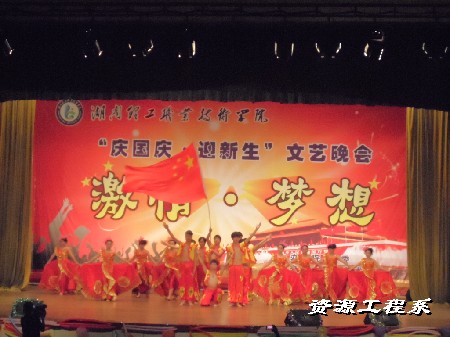 金秋送爽迎新生,硕果飘香庆国庆,2013年9月28日晚七点,湖南理工职业技术学院的师生们齐聚一堂,隆重举行“迎新生,庆国庆”文艺晚会。院党委书记秦裕武、院长罗先进、副院长朱奇卫、洪丕庆、黄霞春、三系领导老师以及大一全体学生观看了此次演出,大家用歌声迎接国庆佳节,用舞姿欢迎2013级新生的到来。