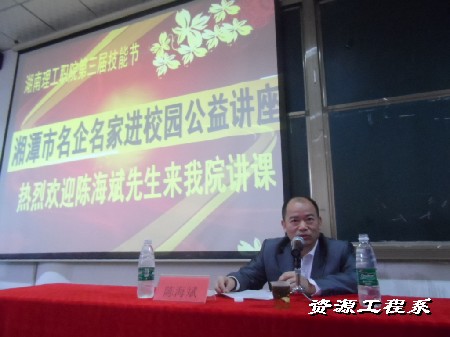 据了解,近年来大学生就业问题受到社会的高度关注,为了帮助我院学生树立正确的人生观,11月22日下午,在三教多媒体一迎来了湘潭市江麓机械制造有限公司总经理陈海斌给我院资源工程系机电一体化、机械设计与制造、矿机专业的同学进行了一次精彩的讲座。出席讲座的嘉宾有:系主任何瑛、系副书记副主任胡志军、系学管干事朱礼、系辅导员郭赟登、谭君,会议由朱礼老师主持。
