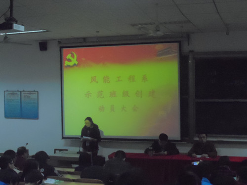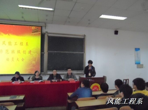 2015年3月26日,风能工程系学工办组织召开的创建示范班级动员大会在三教学楼101教室举行。风能工程系主任何瑛、副主任杨益梅、副书记胡志军莅临大会,全体班主任老师、辅导员及班干部同学参加了本次大会,学管干事朱礼老师主持了本次会议。