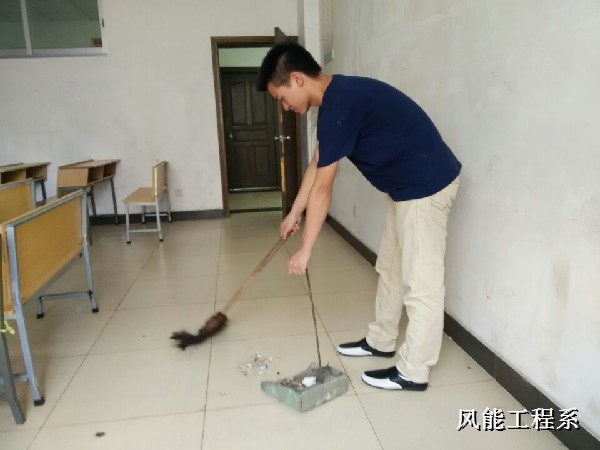 活动始伊,风能工程系学生会干部在会上表明,本次大扫除活动是为了即将到来的2015届新生来到学校有个良好的校园环境,也是为了使学院更好的一面的展现出来。面对着这样的问题,我系学生会干部们纷纷拿着劳动工具准时到达劳动地点。在劳动的过程中,我系干部们把教室的地板拖的干干净净,不放过任何死角。同学们各负其责、配合默契、互帮互助,充分体现了学校风能工程系2014级学生是一个爱团结的大集体。在短短的一个小时中同学们完成了这个艰巨而光荣的任务。