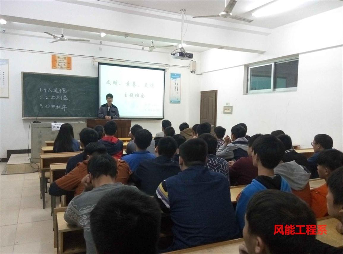 为了提高大学生自身素质,培育“四有”新人,促进文明新风尚,11月4日晚,风能工程系机电1143班在三教105召开了“文明、素养、美德”主题班会。