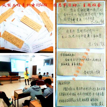 2015年11月26日,感恩节,在这样一个特殊的日子里,我们不仅要感谢生活带给我们的喜怒哀乐,更要对身边亲人、老师、朋友表达最亲切的问候,风能工程系机电1154班组织了“感恩节”的主题班会,让同学们树立感恩意识,感激生活赠与我们的一切。本次的主题班会由班长罗培主持。