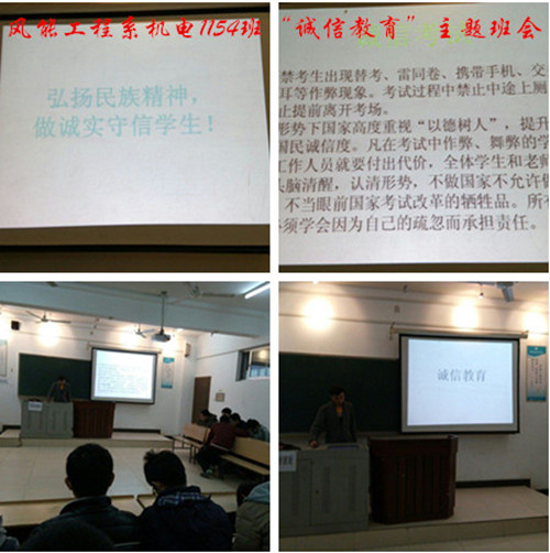 时光匆匆,本学期已接近尾声,为弘扬中华民族诚实守信的传统美德,同时也为了同学们在期末考试中能做到诚实守信,风能工程系机电1154班于2016年1月6日晚自习在3教207教室组织了一次“诚信教育”主题班会,班会由劳动委员黄玮佳主持。