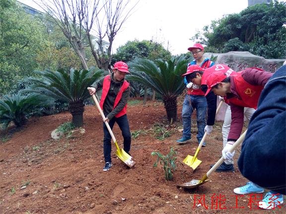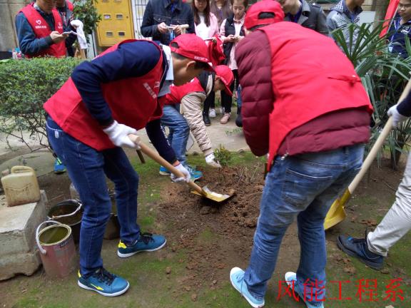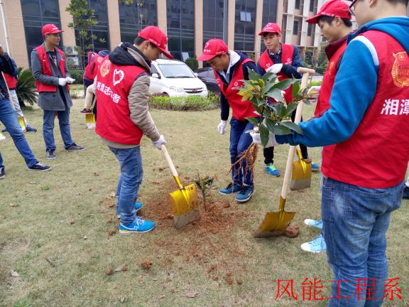 为进一步提高我院学生的绿化意识与文明素质, 2016年3月12日上午,风能工程学院志愿部干事唐舒、彭宇及10多个风能系志愿者有幸参加三大桥沿江风光带和建设路口社区植树造林活动。