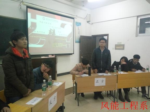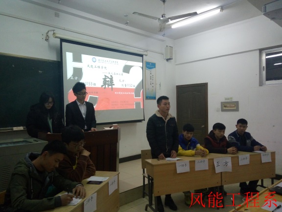 为锻炼我院同学的人文素质和思辨能力,2016年3月13日晚,风能工程学院第九届辩论赛初赛在三教105、107教室隆重举行;学生联合会主席韩礼、副主席刘芮、风能工程系主席陈瑶、副主席龙林等学生骨干担任评委;各参赛班级全体同学观看比赛。