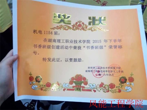 在机电1154班全体师生的共同努力下,营造了一个良好的读书氛围,也激发了同学们的读书热情。因此,在2015——2016年度评选“书香班级”活动中机电1154班荣获第一名。此次荣誉的获得更离不开风能工程学院何院长、胡书记、肖院长对机电1154班工作的指导,以及班主任徐老师、辅导员赵老师、专业带头人周老师对同学们的关心与鼓励,正是这些领导与老师的指导、关心,机电1154班才获得如此殊荣。