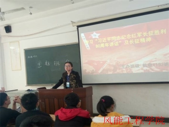 为隆重纪念中国工农红军长征胜利80周年这一重大革命历史事件,缅怀革命先烈,继承发扬长征精神。2016年11月4日 10:00,风能工程学院机电1153班在3教208教室举行学习“习近平同志纪念红军长征胜利80周年重要讲话精神”主题班会。参加此次班会有班主任刘婵老师,以及全班同学。