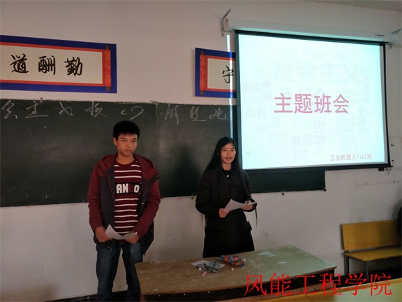 为了深入贯彻党的十八大的精神,积极推进社会主义核心价值观进入课堂,引导学生了解社会主义核心价值观,工业机器人1162班于12月1日在2教205举行了以“社会主义核心价值观”为主题的班会。参加此次班会的有陈筱莉老师和全班同学,本次班会由谭慧和汪杜元主持。