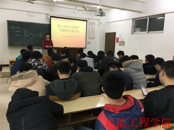 为教育大学生关爱弱者、奉献爱心,引导大学生饮水思源、知恩图报。2017年03月21日上午10:00,风能工程学院机电1153班在3教206教室举行“爱心传承”工程推广主题班会。班上全体同学参加了此次班会,班会由班长周志杰主持。