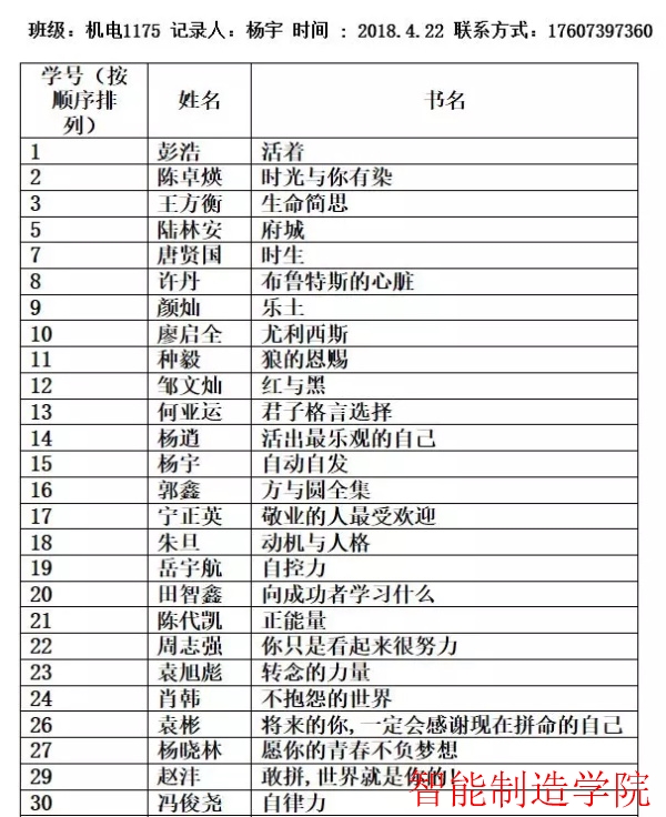 5月带着初夏的闷热已经开始渲染我们的生活,我院机电1175班响应学院的号召展开了新一期的每周一书阅读活动。