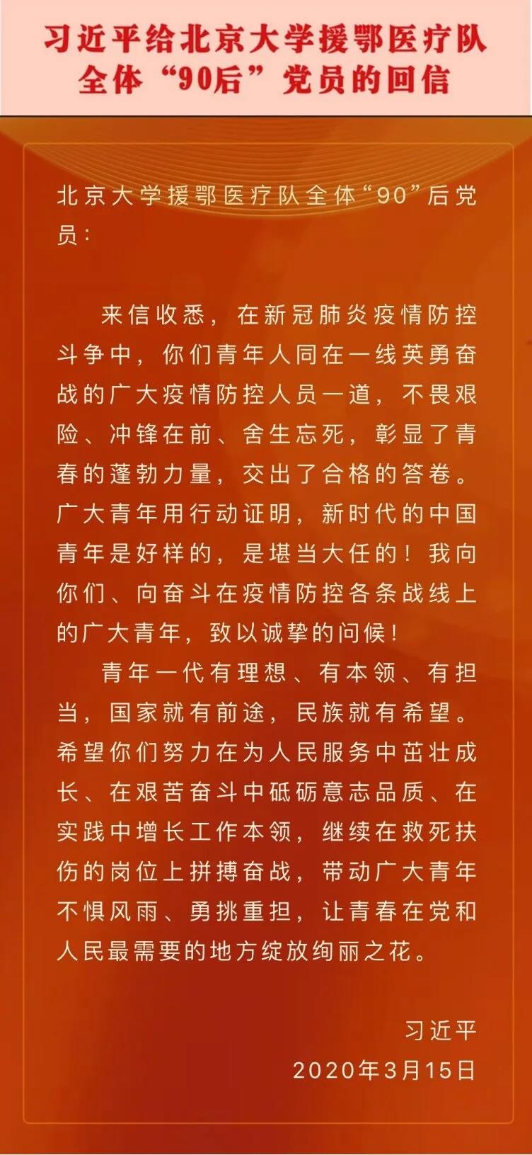 在学习了“习近平总书记给北京大学援鄂医疗队全体‘90’后党员的回信”后,我深有感触。尽管内容不多,但纸短情长,总书记的信总是那么亲切,在一字一行的文字中能感受到总书记对青年真挚的问候及期望。同时,我们也应该学习他们奋勇拼搏的精神,尽管一线医疗防护资源缺少,但他们还是顽强奋战。为了节省医疗防护资源,在每天长达八个小时的工作时不喝水、不吃饭、不解决生理需求。十几年前的非典期间,前辈们为我们撑起了一片蓝天。现在“90后”们长大啦,在来势汹汹的新冠肺炎疫情前,为我们守护静好岁月。青年兴则国家兴,青年强则国家强,作为一名大学生的我们,理应担负起总书记对我们新青年的寄托。