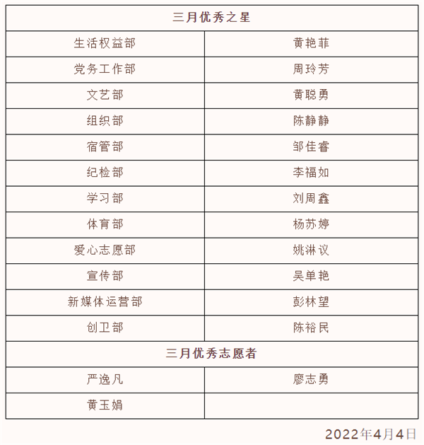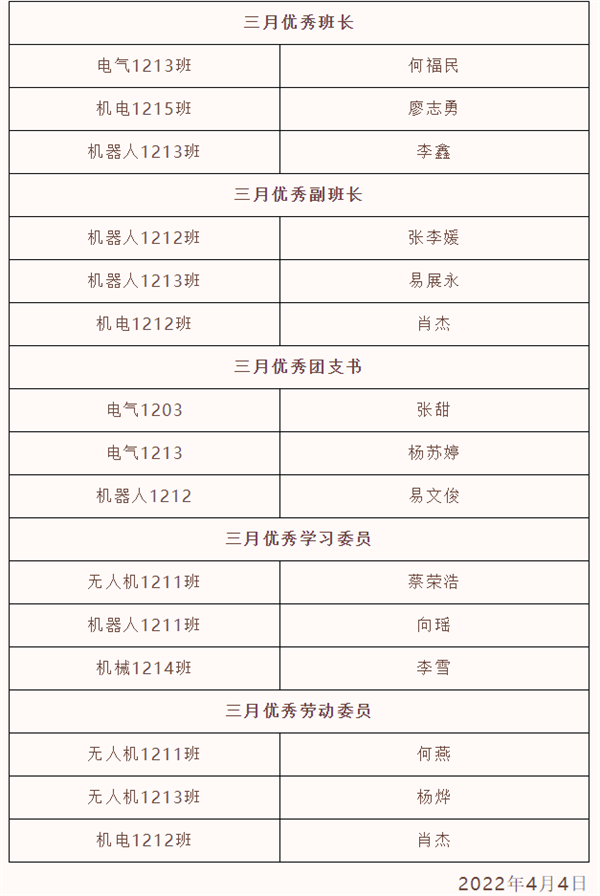 为了引导学生干部开展好有特色、有成效的学生工作,激励广大团员青年进一步坚定理想信念,稳步推进班级工作有序开展。经各班级推荐以及智能制造学院团总支审核,现公示2022年3月优秀之星、优秀志愿者及优秀班干部推优名单。