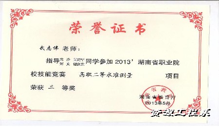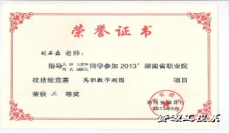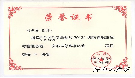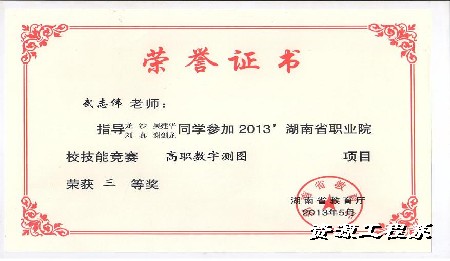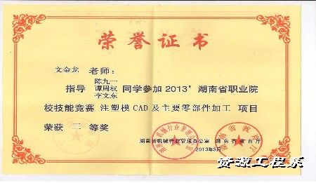 本次职业院校技能大赛于2013年 5月10日开幕,赛期三天,高职组设有12个专业(类),共设31个赛项。其中资源开发与测绘专业类赛项包含测绘二等水准测量、一级光电导线测量、数字测图三个赛项,刘石磊和武志伟老师带领测量1111班谢建龙、刘真、吴建华、龙沙四位同学在高职数字测图和高职二等水准测量项中分别荣获三等奖。在加工制造专业类赛项的工业产品造型设计与快速成型中,文金龙和胡建强老师指导模具1101班学生谭周全、李文东、陈九一同学获得注塑模CAD与主要零件加工三等奖的殊荣。