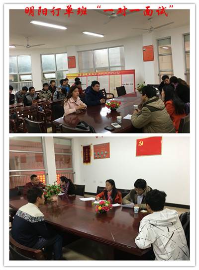 “明阳订单班”面向学院风能工程系风动风维专业、机电专业、机械专业、电气专业2015级大专生招生,招生过程不亚于毕业生找工作的严格筛选,面试最终将选拔50名同学成功进入“订单班”学习。面试中,明阳风电集团HR专员采取 “一对一面试”的形式。面试官会让学生们准备两到三分钟里的演讲,学生先进行自我介绍,HR专员对这位学生印象好的话会在接下来的环节中对该生进行简单提问,“为什么会选择进订单班”、“对订单班有哪些方面的了解”、“为什么会选择这个专业”、“面试成功后想要进入公司什么职位”、“对自己今后的薪资待遇有何要求”等。成功入围“订单班”的这50名学生将进修订单班的课程,课程均由明阳风电集团派出专家和技术工程师进行授课,课程具有很强的针对性。