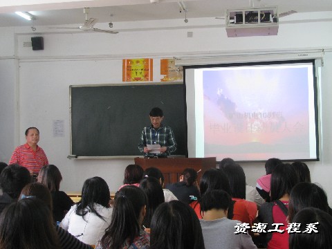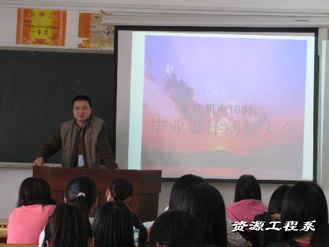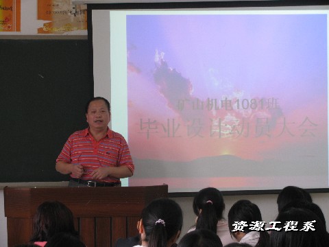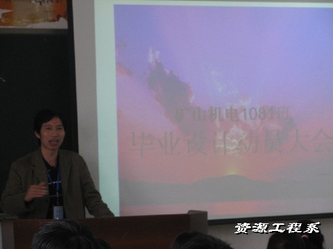 (系矿机1081班邹伟平同学供稿)2010年10月20日,资源工程系矿山机电1081班毕业设计动员大会在三教303教室召开。系主任、党总支书记宁齐元博士、矿机专业李新华老师、肖志平老师、辅导员欧又瑞老师,以及全体矿机1081班的学生参加了此次大会。