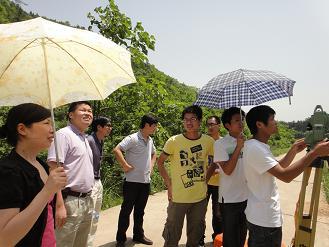5月18日,主管教学的罗院长、资源工程系主任宁齐元、系副主任何瑛一行顶着烈日和酷暑前往本次测量实训场地,看望昭山测量专业实训的学生们。罗院长和系领导们为同学们带上矿泉水和防暑用的风油精,顶着火辣的太阳前往大山深处慰问野外实训的测量学生,亲切询问学生实训的收获,帮助学生们解决实训当中遇到的生活和学习上的困难。巡视中,领导们看到同学们实训步骤进行得井然有序,同学们在测量中运用对讲机传递信息,跑棱镜的同学将自己所要采集的地形地物数据点信息及时报告给测站人员。学生们对院领导和系领导的关心关怀感到莫大的光荣,对领导们表示最诚挚的感谢,并表示一定要在此次实训中收获多多,以优异的实训成绩向学校和系部汇报。