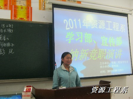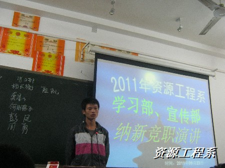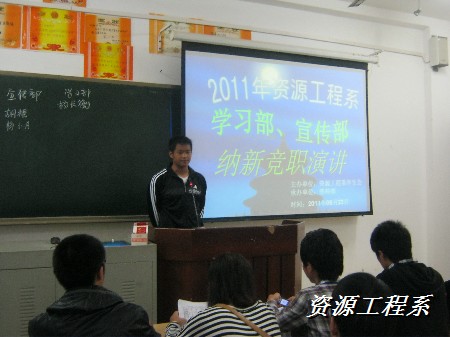(资源系 李军供稿)2011年9月23日、9月28日晚7点,12个部门分别在三教101、102、103、104、105、106教室进行了两轮精彩的竞职演讲。与会人员:主席团成员,各部门部长副部长,及参加竞职演讲的大一新生。