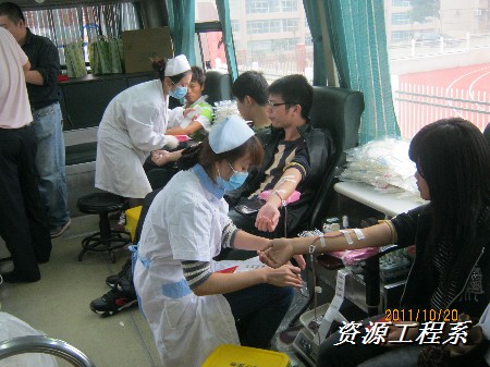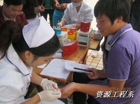 爱心传递---无偿献血 (资源系 李军供稿)2011年10月20日,11点30至16点30在食堂前坪隆重举行了由学院与湘潭市中心血站共同组织的“无偿献血,无尚光荣,奉献爱心,回报真情”大学生义务献血活动。 献血过程中,资源系学生表现积极,现场参与热情高涨,在工作人员的引导下,秩序井然地完成各项正规体检和采血,我系志愿部早早到达现场进行组织。同学们在献血时,面带微笑,打出胜利手势,并表示作为新时期的大学生,愿意参加这样有意义的活动,用自己的热血来帮助那些需要救助的人,为社会尽一份力量。在此次献血活动中,资源系共有46名同学参加,主要以大一新生及学团干部为主,在学院的积极号召下我系并超额6名圆满完成任务。 |
