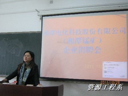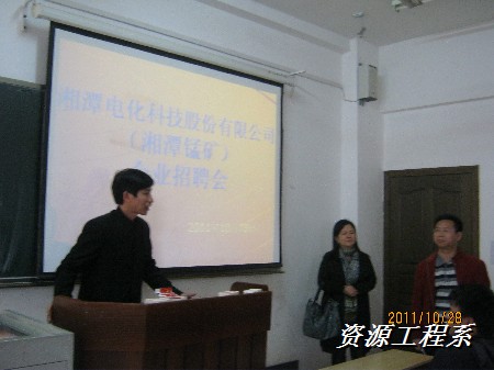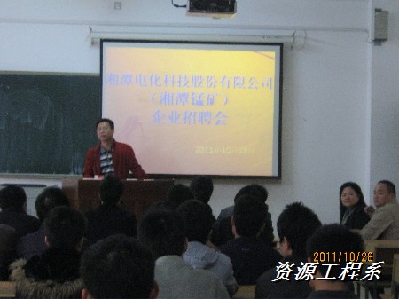 (资源系 李军供稿)2011年10月28日,9点40在三教209隆重举行了“湘潭电气科技股份有限公司(湘潭锰矿)企业招聘会”。出席本次招聘会的嘉宾有资源工程系党支部书记主任宁齐元、系团总支书记陈柏舟、丁总经理、荀部长,及参加招聘的学生。招聘会由宁主任主持。