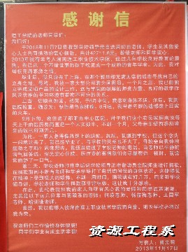大爱无言,收到来自病床前曹光明的感谢信粘贴在学校门口的一刹那,我们除了感动,更多的是被曹光明同学的乐观、坚强、勇敢以及他一颗金子般感恩的心所折服。也许学院的这笔爱心捐款只能解决眼下的燃眉之急,但是滴水成河,聚沙成山。病魔无情,人间有爱,在此,我们呼吁社会各界及爱心人士用真情和爱心为曹光明传递生命的曙光,也衷心希望曹光明同学早日战胜病魔,让他年轻的生命可以继续茁壮成长。(资源工程系 徐军)