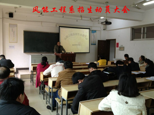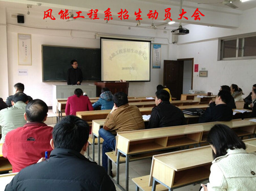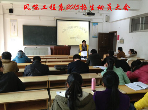2015年3月24日下午,湖南理工职院风能工程系隆重召开2014年招生工作总结表彰暨2015年招生宣传动员大会。会议上,系主任何瑛对2014年系部的招生工作做了总结,并对2015年的系部招生任务做了安排部署。风能工程系全体教职员工参加大会。
