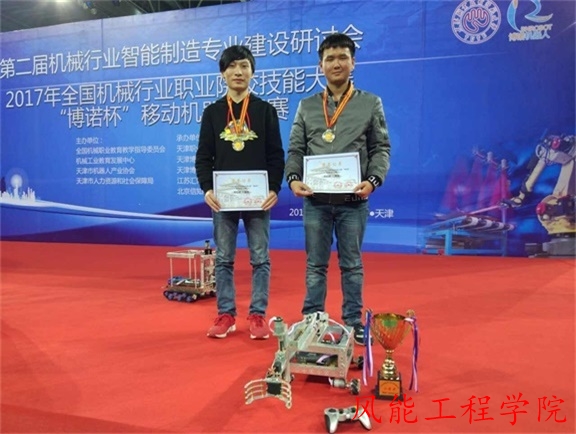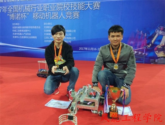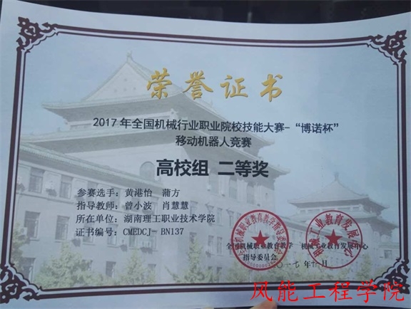 (本网讯)由全国机械职业教育教学指导委员会、机械工业教育发展中心、天津市人力资源和社会保障局共同主办的2017年全国机械行业职业院校技能大赛-‘博诺杯’移动机器人竞赛于2017年11月18日在天津举行。大赛吸引了来自全国13个省区市共计86支队伍参加。湖南理工职业技术学院风能工程学院黄港怡、蒲方两位同学,经过激烈角逐荣获高校组二等奖。