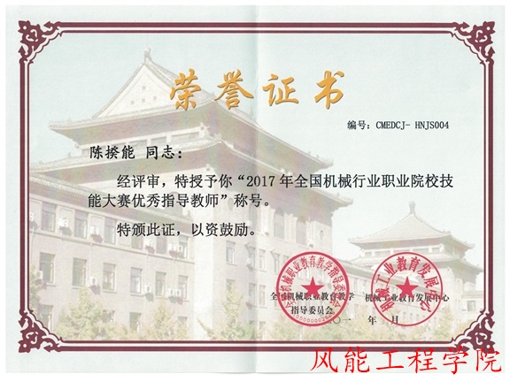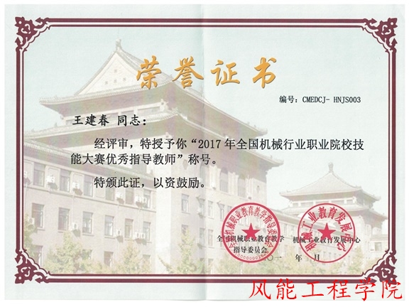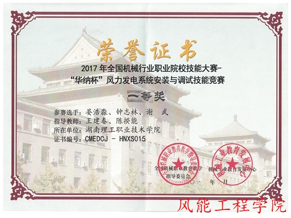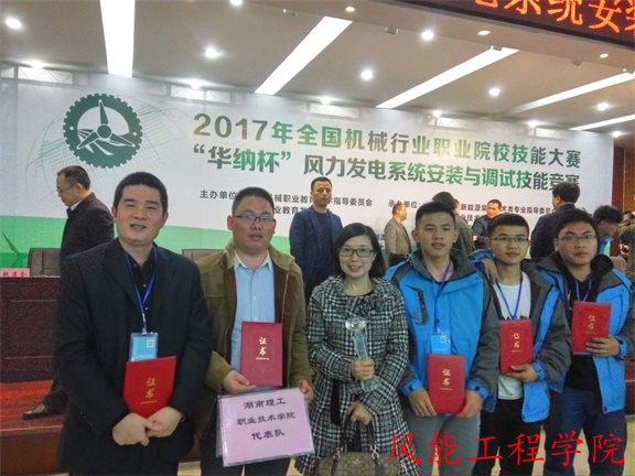 (本网讯)2017年11月20日,由湖南理工职业技术学院风能工程学院王建春老师、陈揆能老师两位老师指导的晏浩淼、钟志林、谢武三位同学,在2017全国机械行业职业院校技能大赛“华纳杯”风力发电系统安装与调试技能竞赛中荣获一等奖。