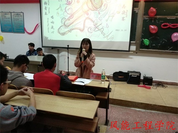 2017年11月27日晚7时,由风能工程学院团总支学生会举办的“飞扬青春,唱响我心”歌唱比赛总决赛,在明理楼南栋110号教室隆重举行。风能工程学院团总支书记吴雅婷老师,学生会各部门成员及班级代表参加本次活动。