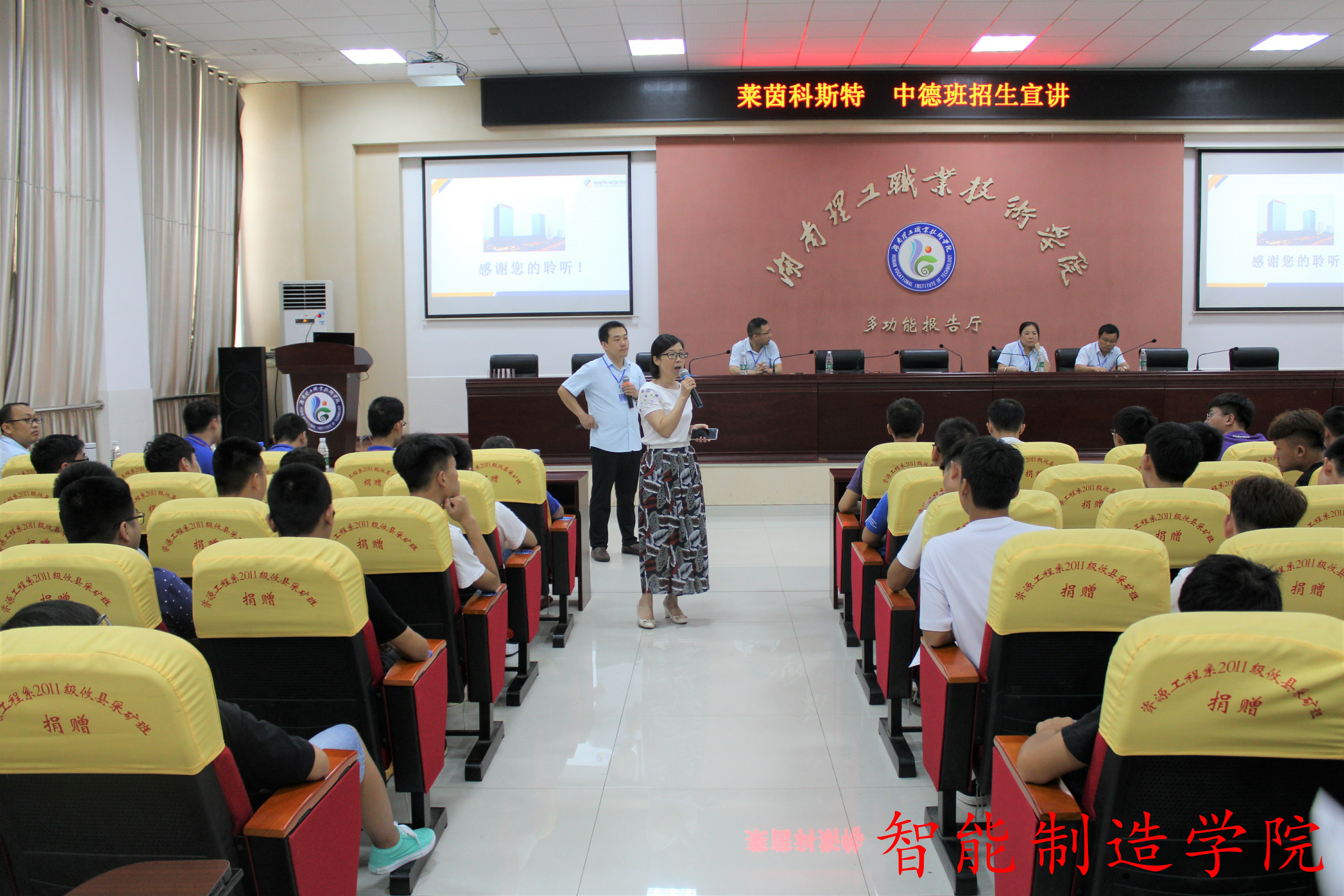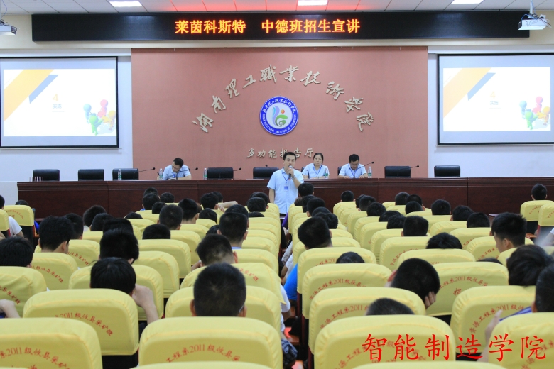 2018年9月12日,德国莱茵科斯特集团中国区就“中德班”组建来我院宣讲选拔学员,智能制造学院院长何瑛、副院长肖慧慧携相关教职员工,18级机电一体化专业全体学生参加了本次宣讲会,宣讲现场气氛火爆。